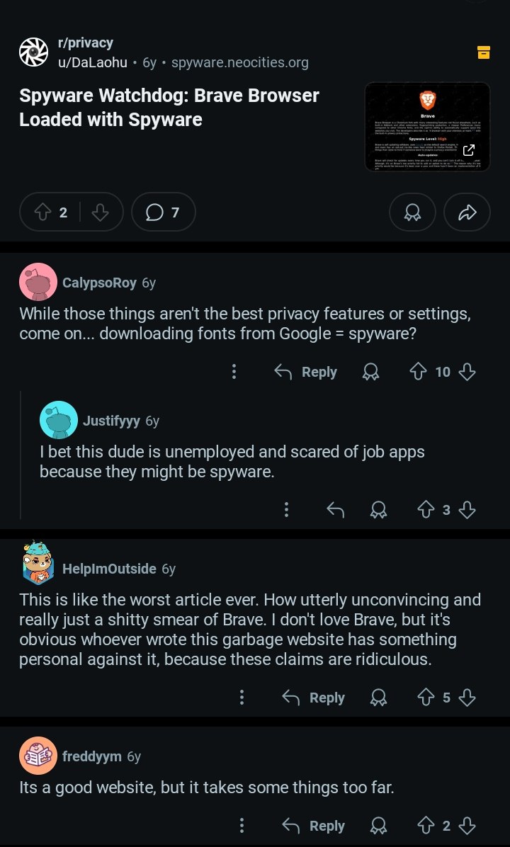 Автор этих статей является труном, у которого уже не один год подгорает из-за Брендана Эйха, основателя Брейв. Подгорает по причине того, что Брендан является сторонником традиционных ценностей и не терпим к ЛГБТ. По этой причине, кстати, он и ушел с поста руководителя компании мазила, а позже основал Брейв.
