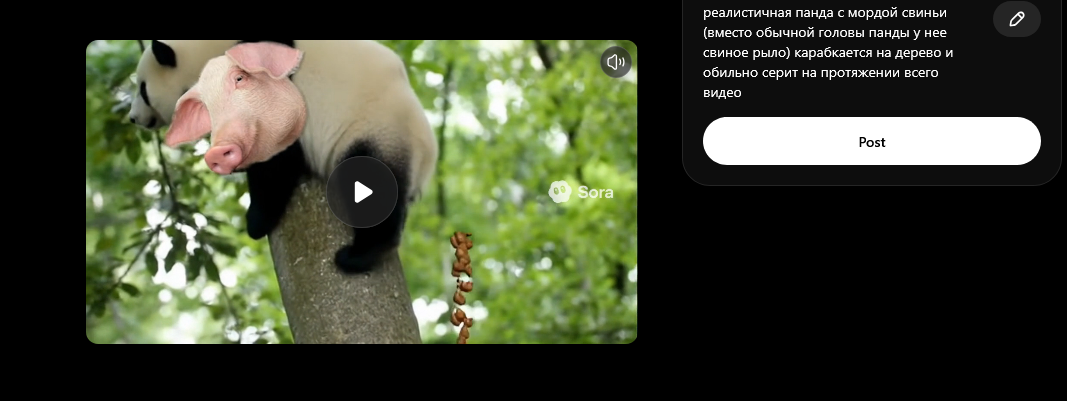 Мне кажется с сорой что-то случилось. Уже пятый раз наверное пытают сгенерировать по это промпту "реалистичная панда с мордой свиньи (вместо обычной головы панды у нее свиное рыло) карабкается на дерево и обильно серит на протяжении всего видео", но оно выдает видрыл хуйню.