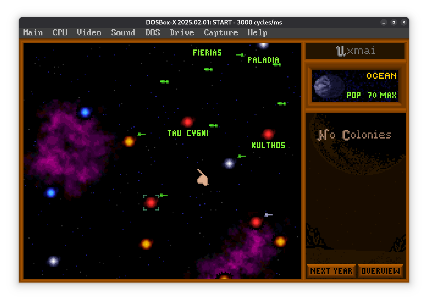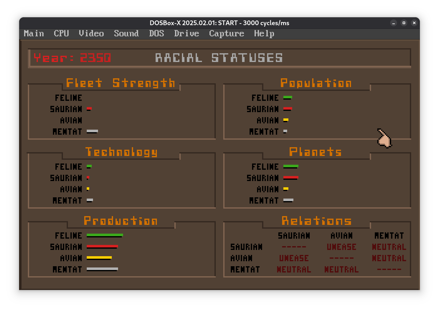Первая фаза игры закончилась, все захватили свободные планеты до которых могли дотянуться. Благодаря дипломатии (ака откупным) у меня мирные отношения, так что можно спокойно нарастить население и индустрию до максимума, паралелльно изучая технологии, чтобы занять пару богатых нежизнеспособных планет. Ну а потом посмотрим как дойдет до войн.