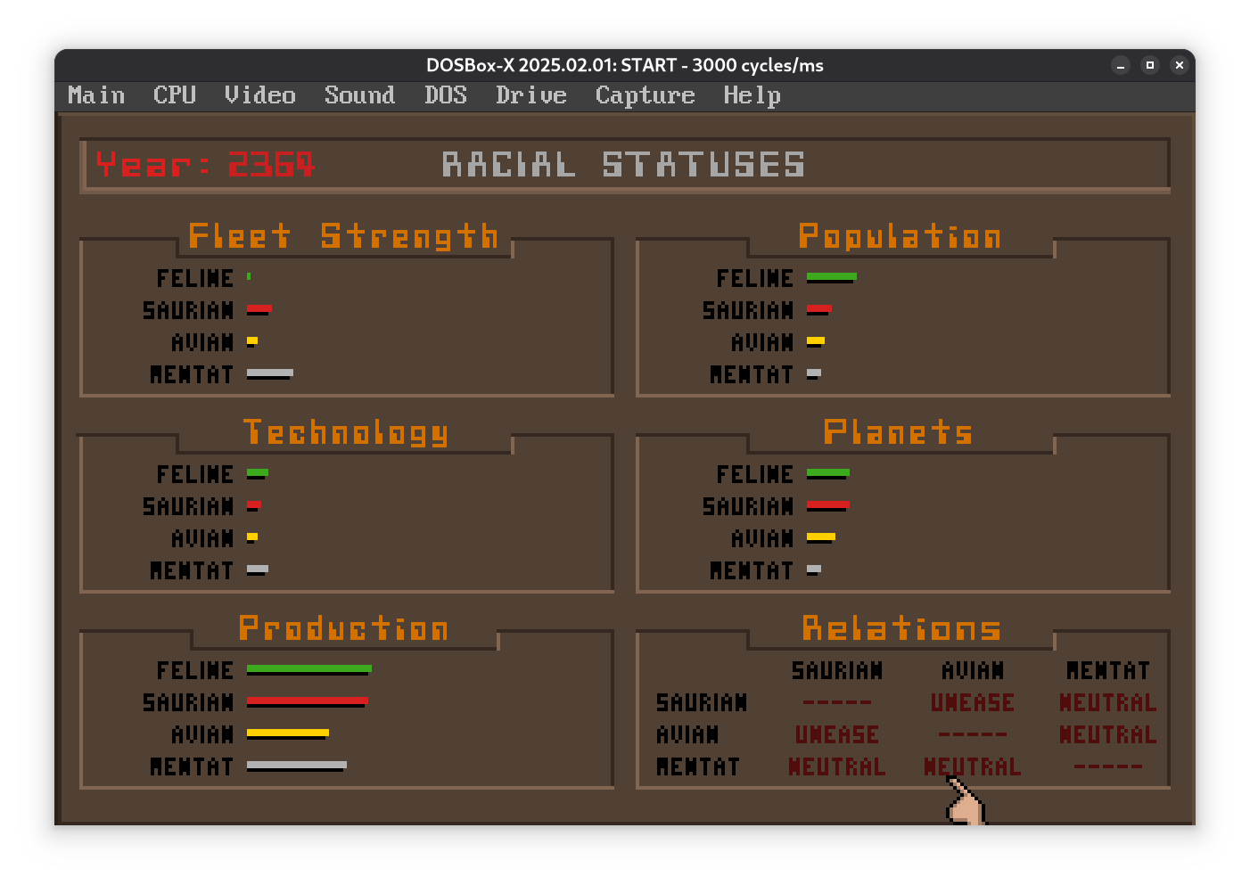 Можно попробовать предсказать развитие, именно у ментатов справа внизу большой флот, с другой стороны ящеры и петухи судя по табличке не особо дружат, может у них будет конфликт.