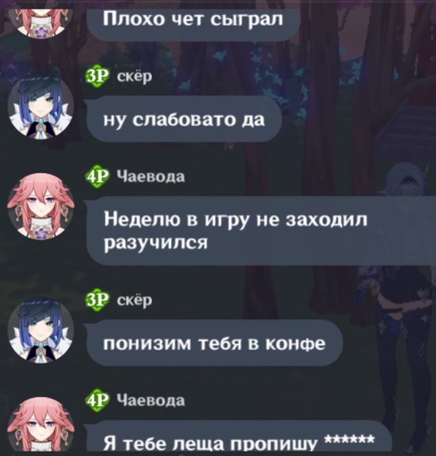 Ты на кого свой львиный зев раззявил чурла ты фатуйская? Ты нектара попрыгуньи обожрался, чтобы на меня прыгать или туманной травы обкурился? Да я с малолетства по Монтштадским зонам чалюсь, с такими Педролино как ты у нас разговор короткий, геослайма к ногам и вперед исследовать Сидровое озеро. Подходи к мосту после отбоя, когда гражданин начальница отдыхать пойдет в казармы и я тебе устрою ТАТАДА. У тебя дупло будет такое, что ветрам в нем сам Барбатос обзавидуется. Век рыбы не взрывать!