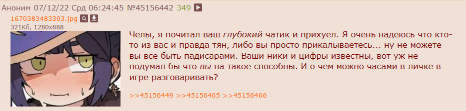 Проблема в том что вы не обсуждаете игру. Никто не хвастается своими успехами в закрытии контента, ни скриншотов, ни видосиков, ничего, тупо шитпост. С тем же успехом вы могли бы сделать тред - фембой общение и делать всё то же самое там, зачем вам треды гача игр? Потому сюда никто не катится. Просто общаться можно и на харкаче, а в местах где обсуждают сами игры обсуждают сами игры и перекат сюда ухудшит обсуждение игры. Всё очень просто.
