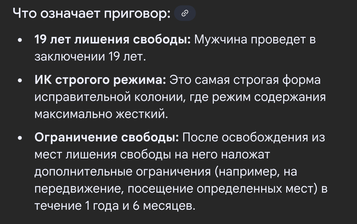 Суд назначил ему 19 лет лишения свободы в ИК строгого режима, с ограничением свободы сроком на 1 год 6 месяцев.