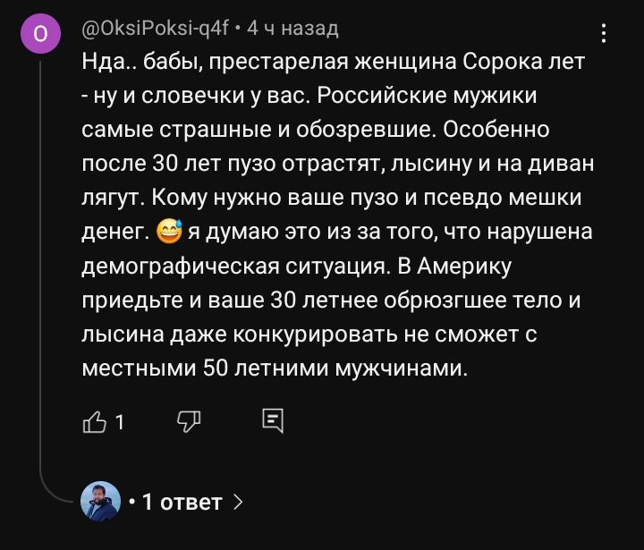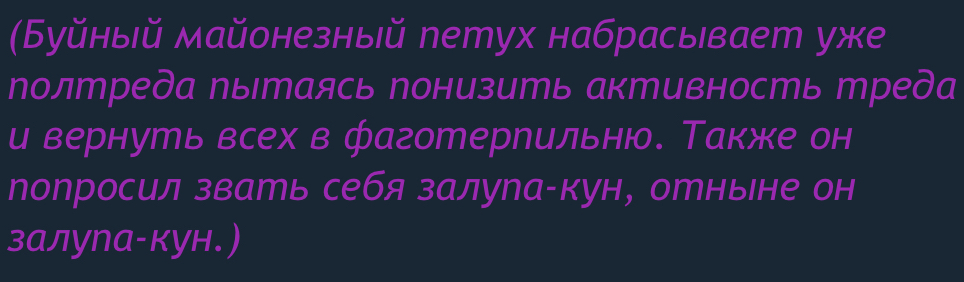 >>1156107 Горжусь я много чем. Просто я не вижу смысла, как вы, оскорблять Россию и Президента. Понимаешь, находясь на таком низком и уязвимом положении, оскорблять человека, который несоизмеримо находится выше тебя во властном отношении, - это просто расписаться в собственной беспомощности. Оскорблять человека, который может тебя раздавить как насекомое - это жалкое стремление возвыситься над собственным презренным статусом. Мы с Зедапом недавно это обсуждали на стриме. Типа, он и я не голосовали за Путина, мы за Даванкова топили, но народ выбрал Путина, при том подавляющее большинство россиян за него кинуло голоса. Мы должны уважать этот выбор. Поэтому это даже как-то не правильно с т.з. гражданской этики оскорблять его. Тем более сейчас идёт война, нахуя внутри страну качать лодку? Чтобы что? Если мы проиграем, думаешь, лучше жить начнем? Да нихуя.