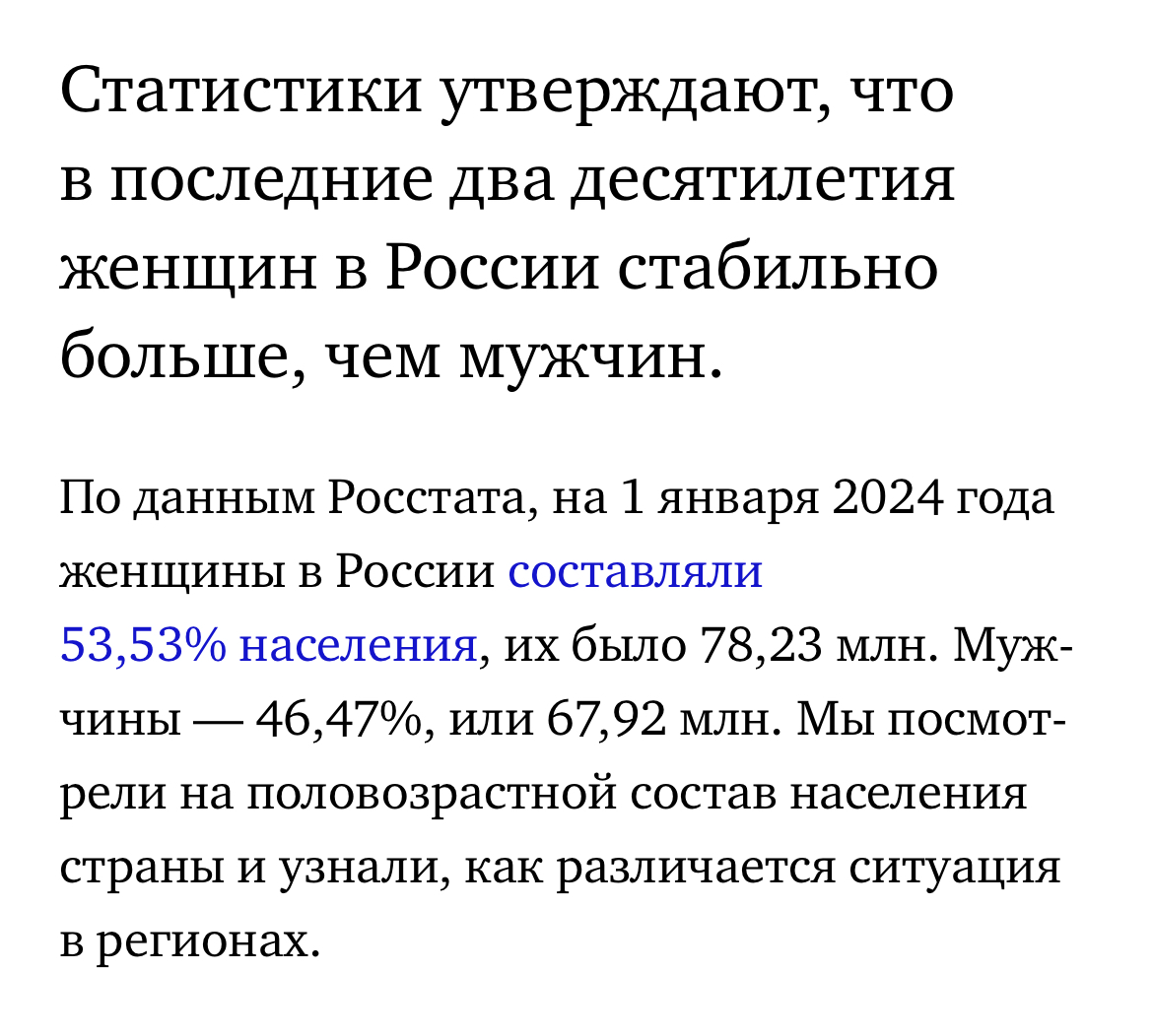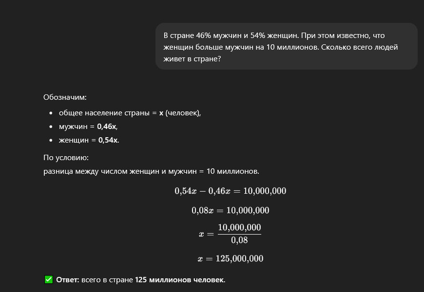 https://www.rbc.ru/economics/20/10/2025/68f24bdd9a7947c1ba01ea0e >Женщин в России на 10 млн больше >В стране 46% мужчин и 54% женщин. Путем нехитрых вычислений: x - кол-во мужчин, женщин = x + 10 (млн), всего населения: x + (x+10) Если разделить кол-во мужчин на все население, то получим 0,46%, тогда Составим уравнение: x/(x+(x+10)) = 0.46 x=0.46(2x+10) x=0.92x+4.6 x-0.92x=4.6 x(1-0.92)=4.6 0.08x=4.6 x=4.6/0.08 = 57.5 миллионов мужчин женщин = 57,5+10 = 67,5 всего людей = 57.5+67.5=125 млн человек.