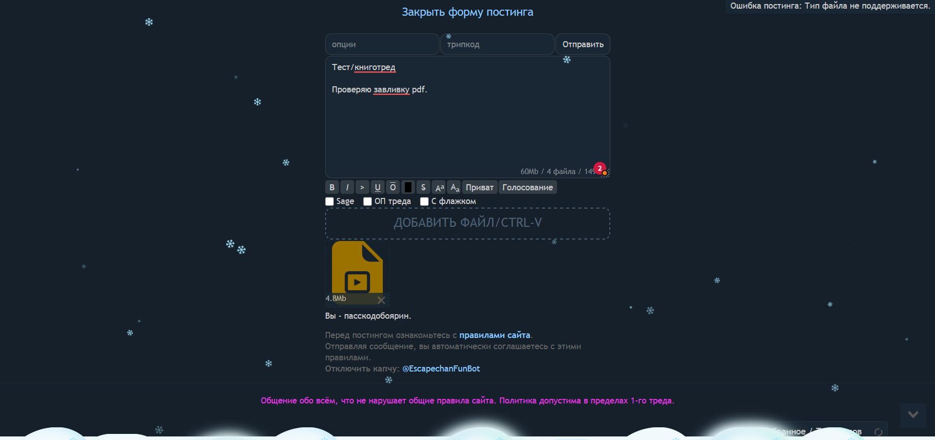 Может добавишь/те возможность прикреплять mp3 к постам? Когда на бордах исчех этот функционал обмениваться музыкой стало неудобно. Нужно вебм из неё корячить, а даже тем, кто это умеет влом это делать.