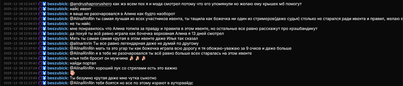 podALINOVIK: @AlinaRinRin я бы тебе задонатил но я все деньги потратил на игры прости. А так хочу вечно тебе донатить. podALINOVIK: @AlinaRinRin ты лучшая ты победила молодец. Так держать. Ты в сердечке навсегда. podALINOVIK: согласен слёзы это естественный анти депресант podALINOVIK: @AlinaRinRin ты просто космос. Береги себя пожалуйста.