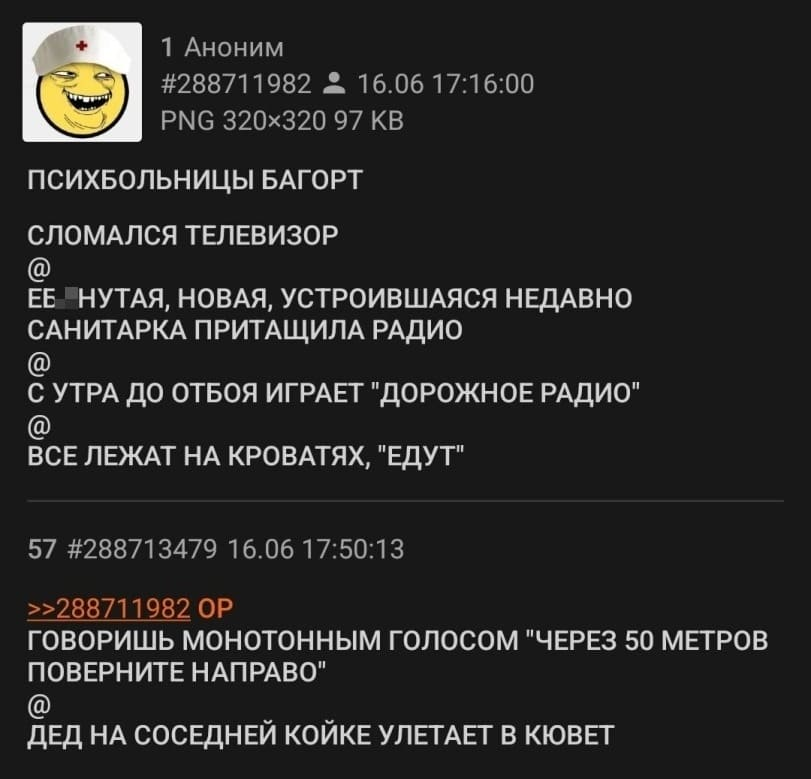 >>1196944 Ахуй. Не, типа, это был буквально первый раз, когда я решил что-то там запостить, так как тема показалась интересной + инвайт недавно намутил. Желание мгновенно отбили. Ну штош... Пусть постят смешное сами тогда. При том, я искренне не понимаю, хули такого в ебучих хлебоходах? Ладно бы я откровенную политоту ещё постил. Сукач точно АИБ, а не филиал одноклассников? Никакого рационального объяснения я найти не могу кроме того, что вилку выдали каким-то гречневым скуфам, у которых с этого срака горит.
