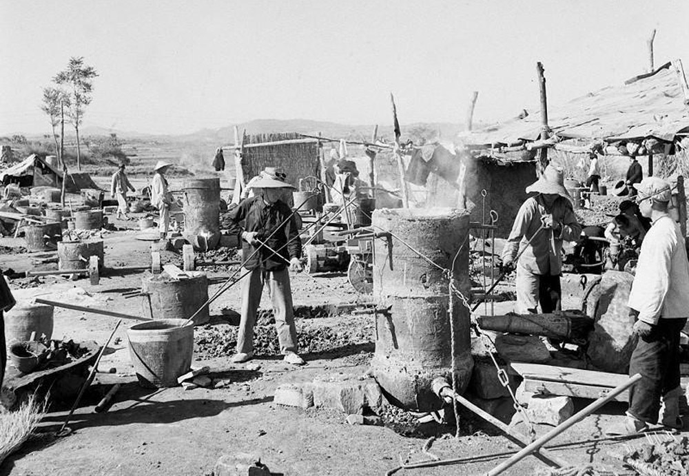 На заседании Политбюро ЦК в августе 1958 года приняли решение, что производство стали должно удваиваться каждый год. Для этого все коммуны в Китае должны строить печи для выплавки чугуна. По всей стране стали строиться печи из для плавки стали из руды. Печи делали сами и обогревали дровами, рабочих набирали из близлежащих деревень.