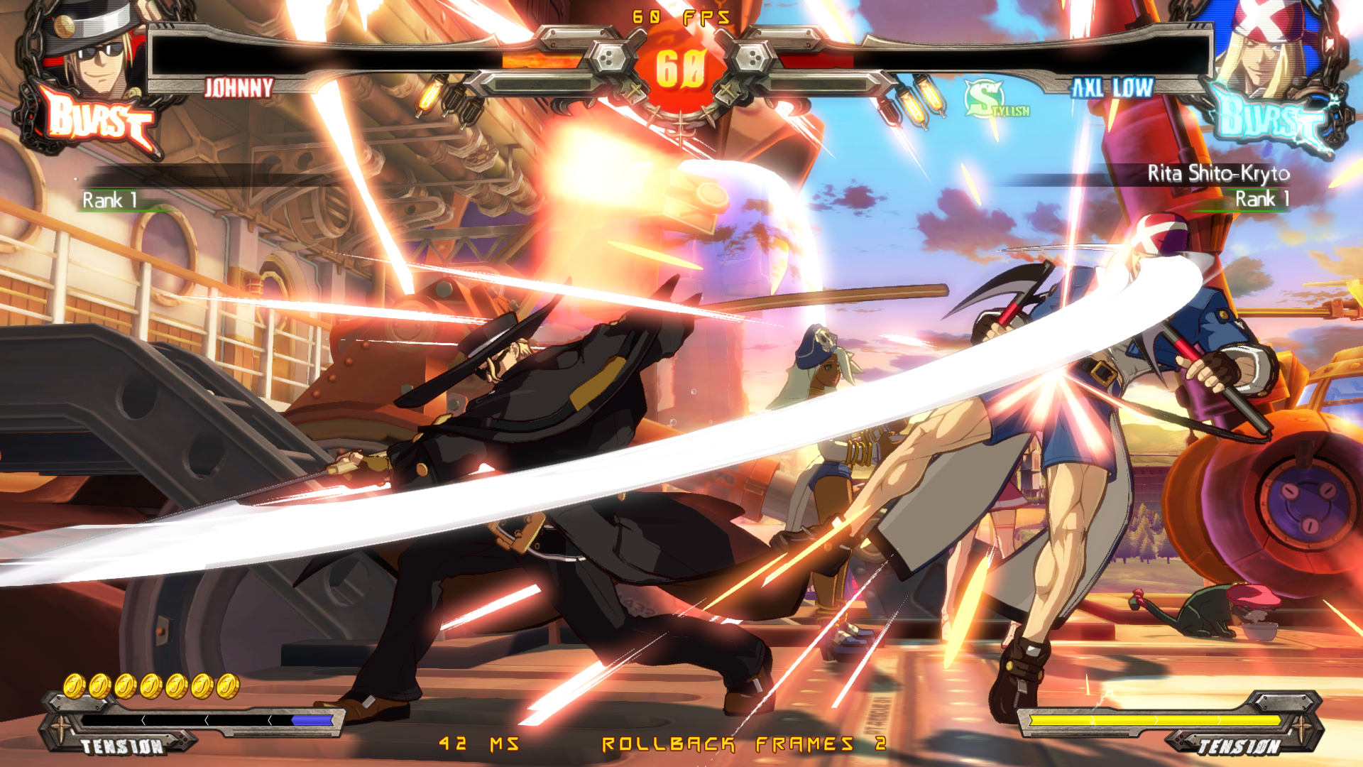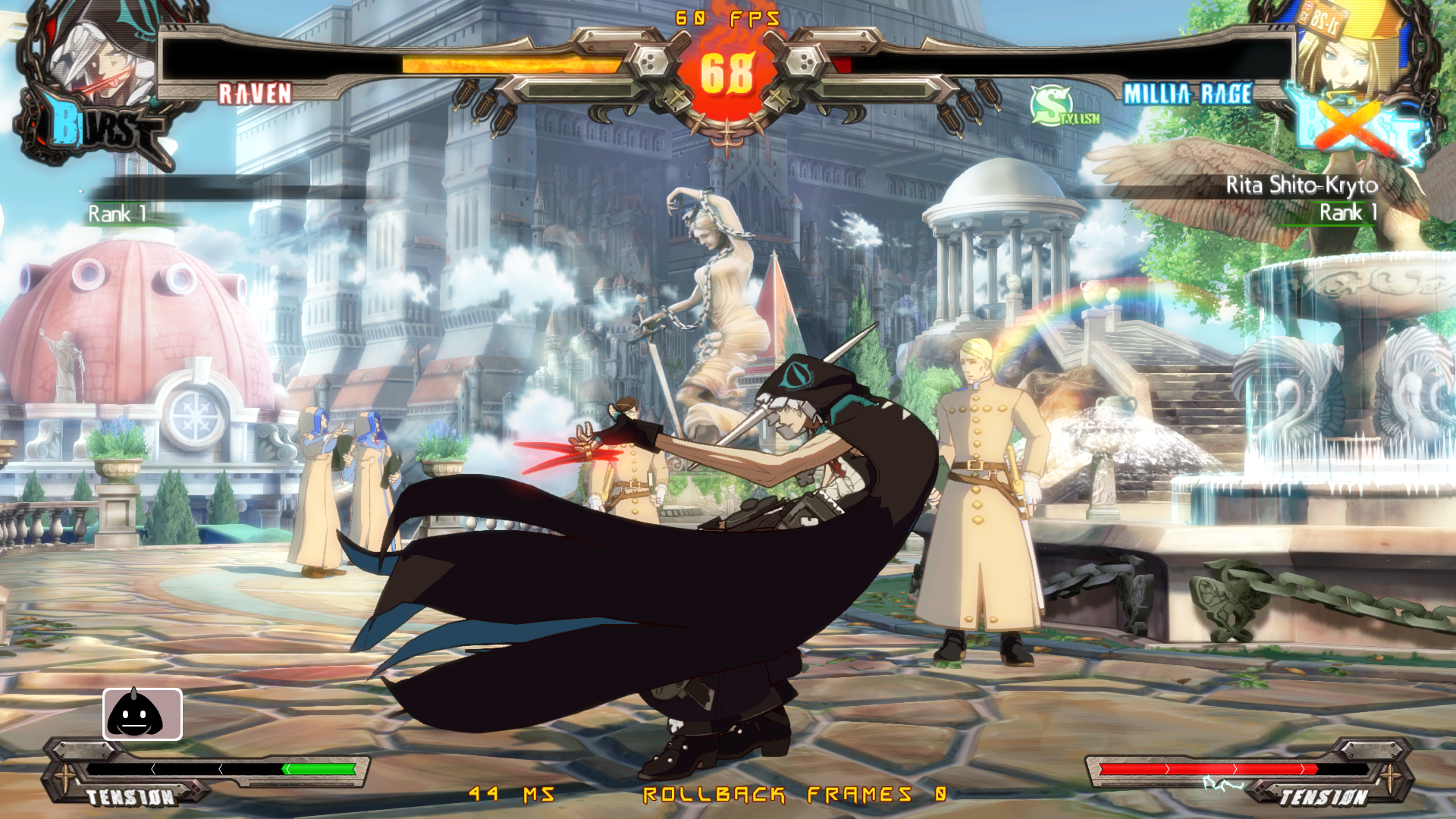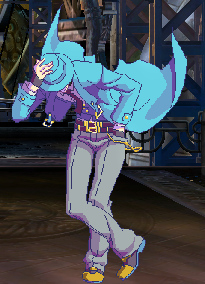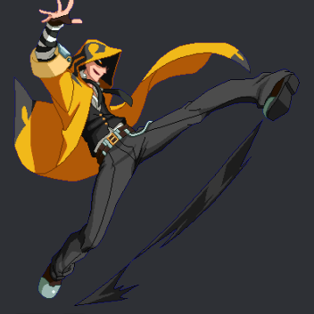 У Чмороны вместо эйрдэша как бы планирование вниз. Он быстро снижается и летит близко к земле, при этом имея возможность атаковать и скорее всего эти атаки коннектятся в наземные потом. У этого явно есть и минус - из корнера не выпрыгнешь. Ещё у него длиннющие нормалы и довольно быстрые проджектайлы-иголки, плюс есть медленный антиэйр орб. Ещё у него есть специвальный ресурс, который по чуть-чуть капает с некоторых ударов (непонятно как его им набирать) и генерится быстрее когда входишь в специальную стойку, в которой просто стоишь. Если тебя в неё бьют, то ресурс генерится ещё быстрее плюс ты имеешь шанс отрегенить полученный в стойку урон то ли нанося дамаг быстро после этого, то ли просто его не получая. Я точно не уверен. Чего ресурс делает я не уверен, помимо того, что он увеличивает явно урон и анимации ревёрсал ДД. Ну и в целом Чморона такой фриковатый около-мазохистский персонаж похоже.