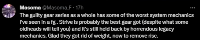 Кошкочел наныл на персонажа, который может юзать ревёрсал, который стоит пол метра и при этом не дамажит без специального ресурса. При этом он ныл это сидя на персонаже, который тоже имеет инвулёвый супер из любого удара с кучей урона по дефолту. Лицо имагинизировали? Челик был недоволен, что его могут чут чут наказать когда он бежит пуская слюни граб жать, ведь ето пик его гейплея.