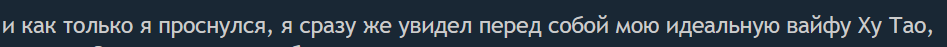 Сегодня ночью я спал необычно долго - целых 14 часов и как только я проснулся, я сразу же увидел перед собой мою идеальную вайфу Ху Тао, или, если быть более точным, то её антиканоническую версию. Она как всегда разбудила меня ее милым голосом примерно как на видриле, а затем мы вместе с ней лампово смотрели аниме в обнимку. Как же охуенно и приятно осознавать, что у презренного нормискота ИТТ никогда не будет ничего подобного.