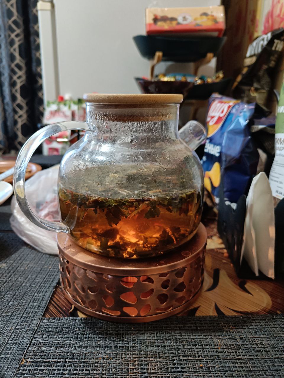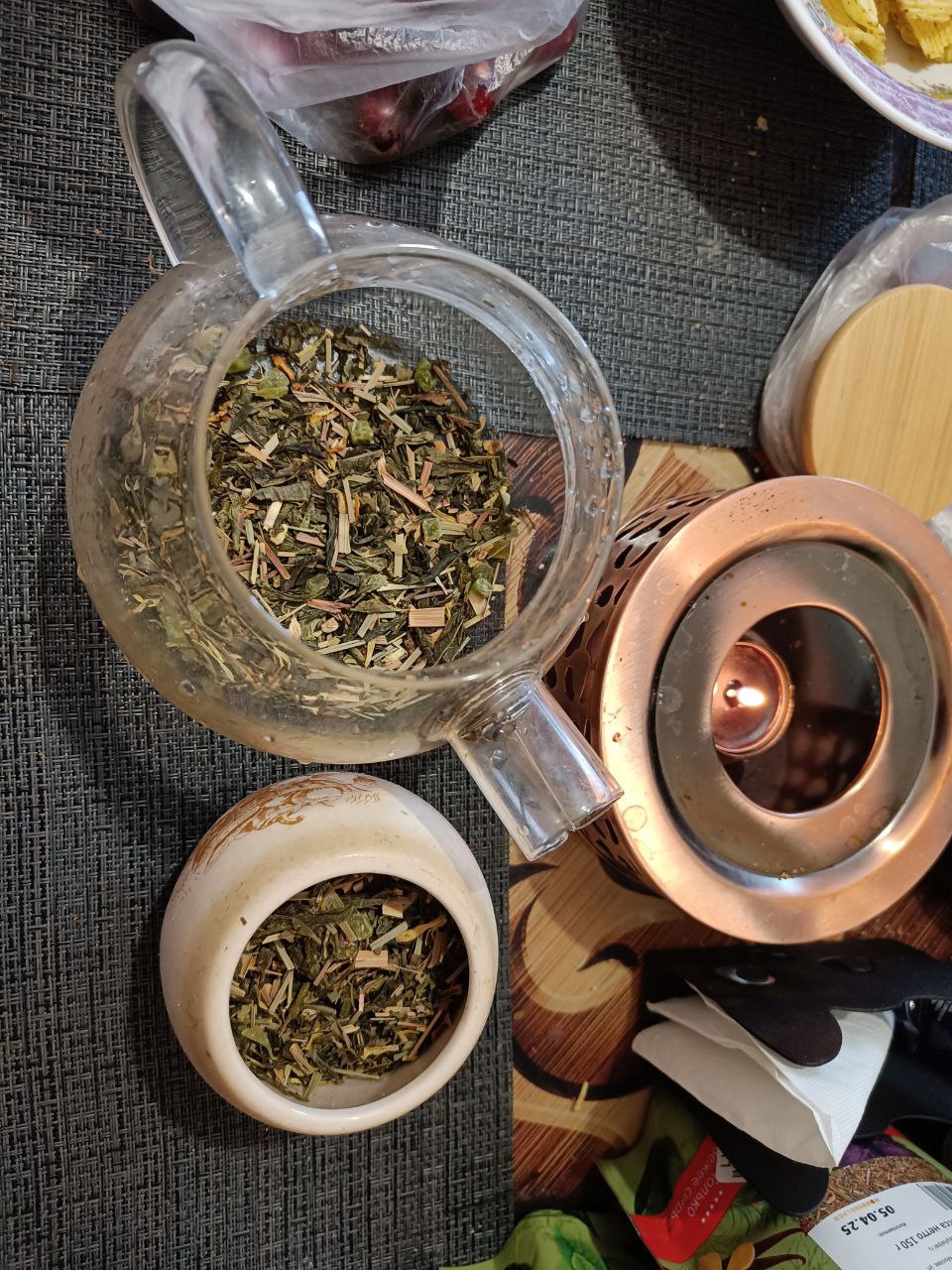 За 300 рублей покупаешь заварочный чайник, чайные свечи самые дешёвые (50р за 10 штук), чай Слон фруктовый или чёрный, 80-120 руб за пачку. Заливаешь листочки и ведёшь эфир на протяжении часа