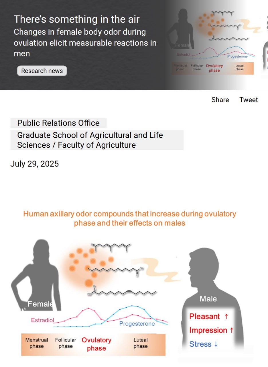 Японцы нашли три вещества, которые активнее выделяются у женщин в овуляцию. Когда мужчины вдыхают этот запах, они воспринимают женщин как более женственных и привлекательных. Самое главное — эти соединения снижают уровень стресса.