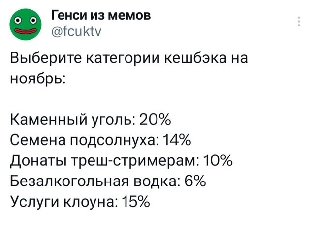 потом вернулось хуйло стал снова душить и бизнес и оппозицию, свободы, крутить гайки, дал команду гойда, разграблять страну снова до полного уничтожения, куча товаров уже тогда пропало, но всё ещё были самые известные бренды, вроде как терпимо, хотя уже тогда пропал и сыр дешёвый европейский, а "наши кабанчики" стали на родные товары ценники поднимать так как хуйло запретило конкуренцию оправдав это интересами безопасности, пропали дешёвые качественные фрукты, мясо резко дало по газам, пропала почти вся рыба, ибо рынок стали захватывать почти все рыбозаводы прихватизировали дружки хуйла и стали все морепродукты толкать за границу, он же принял указы которые увеличили квоты на продажу, то есть раньше было правило сколько-то на внутренний рынок, сколько-то зарубеж, хуйло это по сути ликвидировало и всё пошло за границу