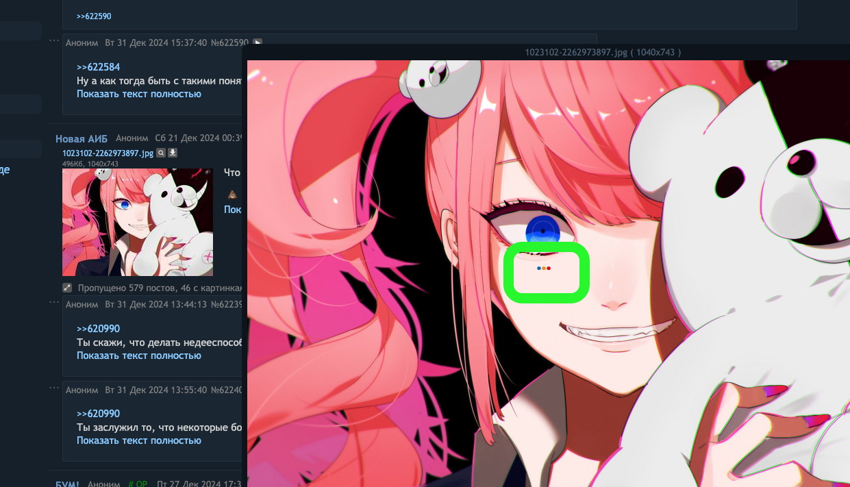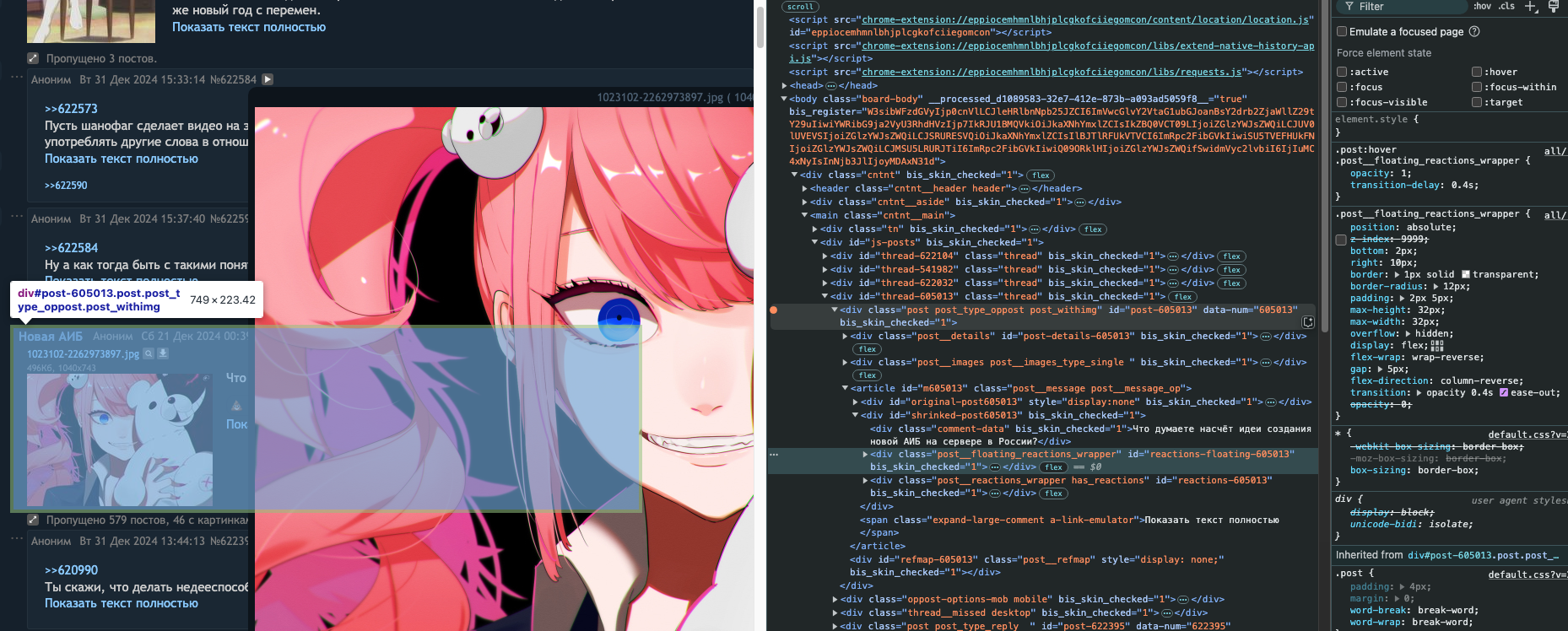 Привет всем. Мелкий баг с менюшкой эмодзи. Если пост длинный, менюшка появляется поверх открытой картинки, обвел зеленым. Workaround - если просто убрать у этой менюшки z-index (видимо, остаток от чего-то еще, потому что не понял, зачем он нужен), то функционал сохранятся, эмодзи ставить можно, но при открытой картинке баг ожидаемо пропадает.