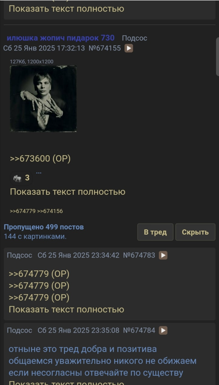 >>953537 >Дорогой анончик. Ты по крайне мере более 2 недель (а по словам пользователей раздела даже более 2 месяцев) оскорблял и поносил администрацию и модерацию Дорогой модчик. Не было такого, никого я из перечисленных 2 месяца не поносил. >злился из-за каких-то перекатов что тебе не давали перекатить ведь кто то успел на 30 секунд быстрее тебя (а по правилам раздела остается перекат сделанный раньше) Это тут вообще не причем. В моем было больше людей, а вы сговорились "прикрыть" друг другу спинки и угнать анонов. Он был раньше, просто до бамплимита 2 поста, ну видимо очень большая разница. До бамплимита катили и раньше. Решили поступить по правилам? Пусть, на здоровье. >постоянно агрессивно требовал добавить твой смайлик. Прям агрессивно и прям постоянно, дооооооо, я его просил добавить когда содер был в треде, и вообщем-то только время от времени постил картинку. >Логично, что этим ты всех достал и вызвал негативное к себе отношение как у модерации, так и у простых анонов с треда У одной бабахнутой свиньи, чего уж там, видимо настолько жирная, что одна его туша заменяет половину населения треда. А с тобой я только посрался недавно, явно не "2 месяца назад". >Аноны устроили несколько голосований и показали что настроены (не против твоего реакта конечно, никто не обижается на смайлик, но против тебя лично за твоё токсичное поведение) негативно В треде токсичности хватает и без меня, но и я общаюсь с анонами дружелюбно. Это не аргумент, ты ставишь в укор то, что постоянно происходит (срачи), вне зависимости от меня. Реакт "пидор" или "терпи" наверно, признак доброго невинного чатика с няшками? Тёрки у каждого есть, так или иначе, но парни добрую часть проявляют, как я в том числе. Далее, я уже писал, факт одобрили, всё, незачем после добавления реакта, носиться с опросами по запросу хрюшки, их делать надо на пути решения добавлять или нет. В итоге на опрос навалили огромную кучу жирафьего дерьма, как будто его не бывало. Демократия-демократией, но когда дело касается 100 рублей ЗА ВСЮ ИСТОРИЮ БОРДЫ невозможно следовать решению. >После этого модерация решила не добавлять твой реакт А потом наплевал на "демократичный опрос" так называемый. О себе не нужно говорить во множественном лице. >но другой добрый анончик переубедил её и от чистого сердца задонатил аж 100 рублей впервые за всю историю борды. Реакт за который ты так ратовал добавили благодаря тому анону, но ты всё равно озлоблен и обижен, обозвал как модерацию, назвав её проститутской, так и того анона который тебе помог, назвав его терпилой. У того анона никаких претензий к модерации нет, он сам сказал что деньги возвращать не собирается. Я уже писал всё в прошлом посте. Я не попугай, сто раз одно и тоже повторять. И этого анона я терпилой не называл, сказал лишь, что это гнилой поступок (не с его стороны), вот и всё. В любом случае, это в первую очередь на твоей совести. Ты "по-приколу" продал бесплатный реакт, и не удосужился следовать "результатам дем.опроса", как и пояснить "анончику", что одобренный смайл мы отменили сляпанным наспех голосованием, придумав идиотские причины после. Человек, изначально донатил на смайл, а не на благотворительность. За свои решения будь добр, держать удар, и не пасовать перед 100 фублями, так как раз знаешь кто поступает? Ты знаешь. Либо возврат, либо перенос на нужды борды. Анон бы соглас
