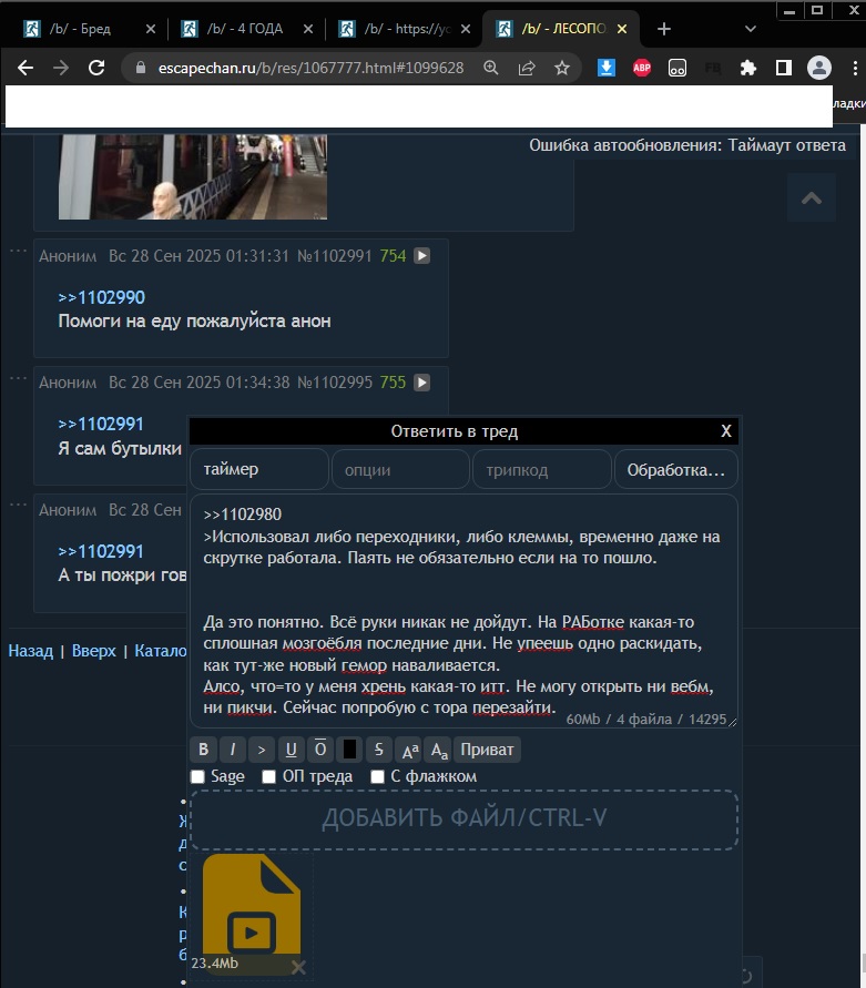 >>1102806 В общем с Хрома у меня в моём лесополосном пикрил. Причём в Хроме висит "ошибка автообновления" и мой последний пост до сих пор "не отправился". Зашёл с ТОРа и тут всё нормально. Мой пост с пикчи уже давно отправлен. После перезагрузки страницы в Хроме, вижу что пост отправлен, но включить вебм, которое я сам-же и отправил, так и не получается. Скорее всего проблема на моей стороне, в Хроме, но что-то я ума не приложу, в какую сторону копать.