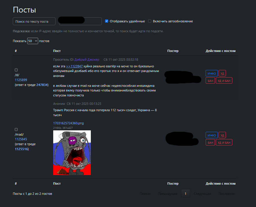 Итак, пришли жалобы на удалённые злым модератором посты в /mad/. Я проверил модлог, удалённых не было, проверил тред — видно что был единственный пост, который был удалён автором по таймеру. Оба поста с жалобами — оставлены первым постом с нового айпи. Оригинальный пост с таймером — отправлен из подсети, которой последнее время пользовался вайпер в разделе. Сообщил пожаловавшимся. Тот ответил, что тредом ошибся и удалили в другом. Проверил другой тред, там четыре поста, удалённых авторами. И ни один не совпадает с описанием поста, который, якобы, удалил модератор.
