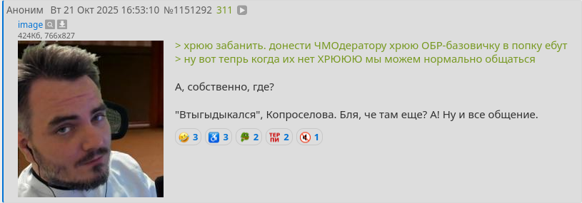 >>1151418 >>1151455 Ескейпчую этих молодых людей. ЧМОдератор порвался от нескольких постов и начал искать неких ОБР-базовичков, хотя по реактам и ответам видно, что именно обр-братвы и хрюкающих подзалуп примерно одинаково. Но на этом мочератор не остановился. Он начал детектить своего протыка в одном из Анонов, некого Залупа-куна, видимо ЧМОдератору что-то порвали, хз. И все это для защиты некого "нормального общения" нескольких трипоблядей и аватарко-симподаунов срущими с нескольких браузеров.