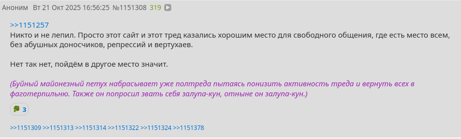 В главный тред всей борды ворвался какой-то петух на модераторе, начал прессовать политического анончика, раздавать баны и тереть посты. Даже нейтральные.