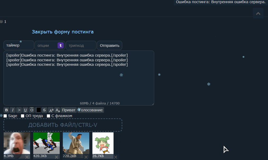 Пытаюсь запостить в лесополосном webm. Пишет "ошибка постинга: внутренняя ошибка сервера". Переконвертировал в мр4. То же самое. Переименовал - не помогло. Причём другие ролики постятся без проблем, а вот конкретно один этот - не фига. Вес 7 МБ. Чому так?