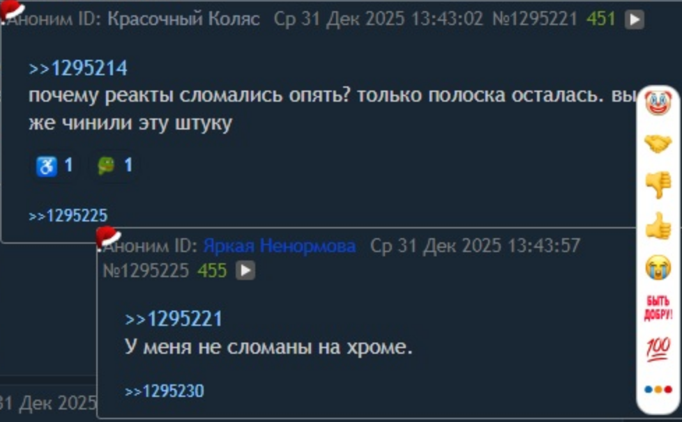 Из оверборды поставил реакшен, который уже ставил, на пост в /chat/. Написали пост не существует. Перешел на доску, там все работает, повторная реакция аннигилируется, заново успешно ставится.
